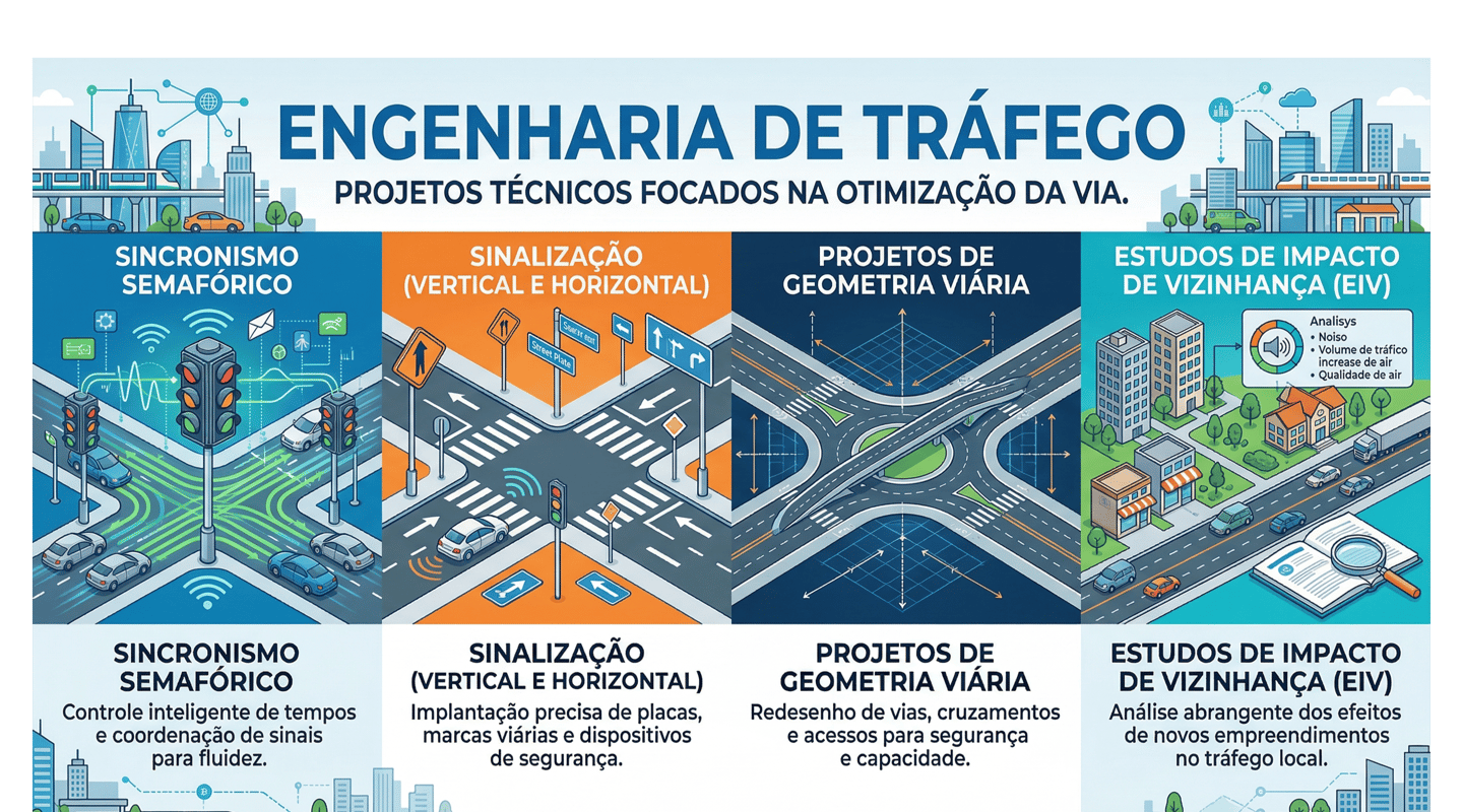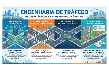 Projetos técnicos focados na otimização da via. Atuamos com sincronismo semafórico, sinalização (vertical e horizontal), projetos de geometria viária e estudos de impacto de vizinhança (EIV).