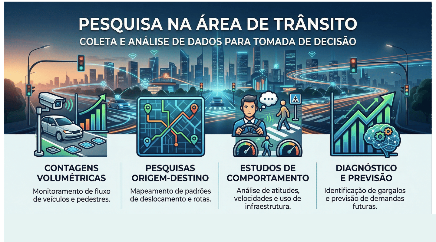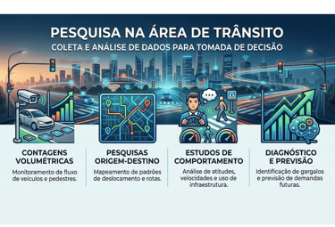 Uma Coleta e análise de dados fundamentais para a tomada de decisão. Realizamos contagens volumétricas, pesquisas de origem-destino e estudos de comportamento do usuário para diagnosticar gargalos e prever demandas futuras.